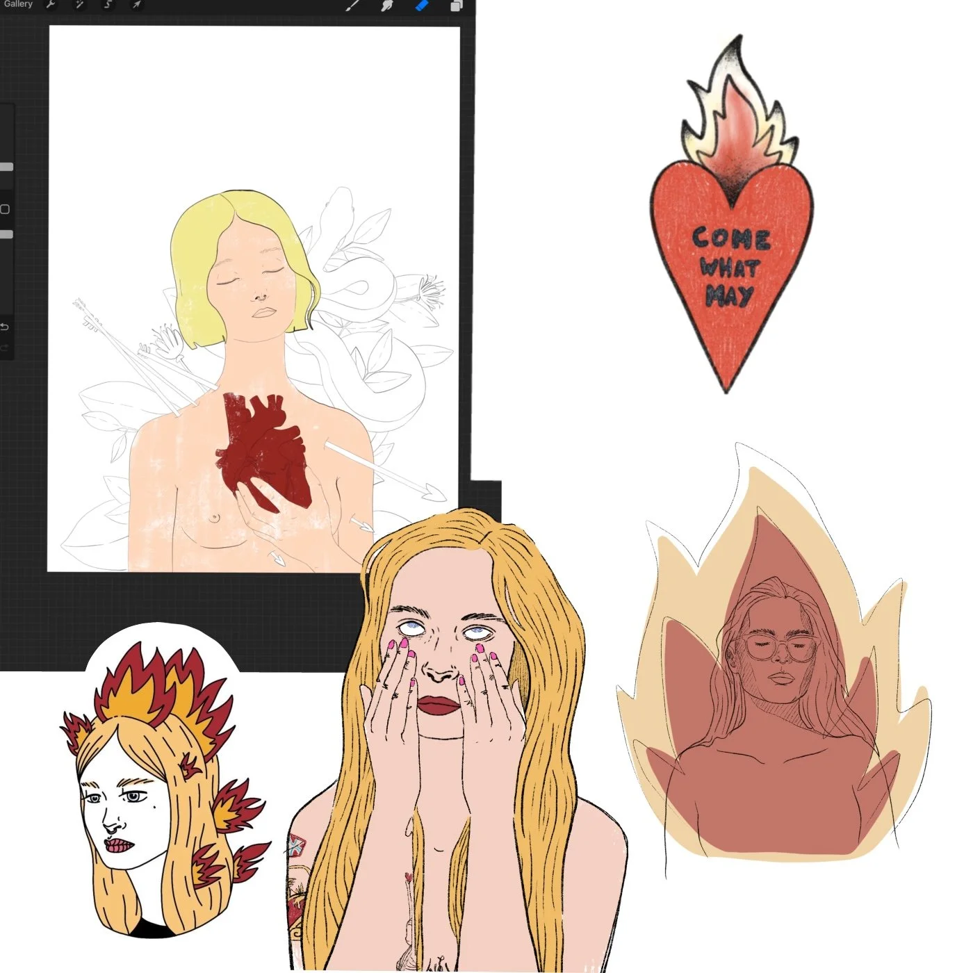 I now work entirely digitally in Procreate. My process begins with a pencil sketch, followed by inking with a black “ink-like” brush, and finally adding color layers for skin, hair, and details. This structured workflow gives my illustrations a cohesive and recognizable style.