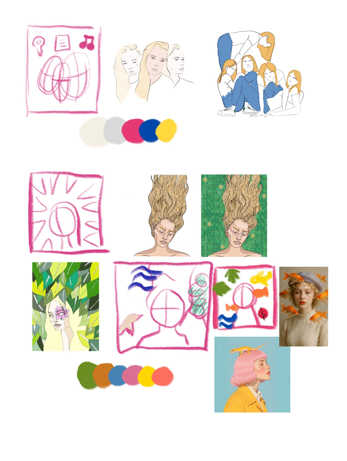My process began with quick sketches based on earlier works, followed by experimenting with composition and tone. The self-portrait with the grass became the foundation, and I expanded the scene by adding animals to create a dreamlike atmosphere. The shadows helped tie the elements together into a cohesive whole.
